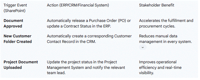 Compliance Metadata: Use data from transactional systems to automatically populate essential metadata fields within SharePoint, ensuring documents meet internal auditing standards.