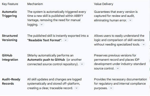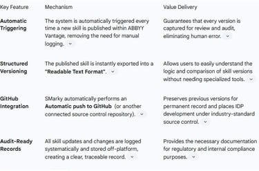 Core Value Proposition: In modern enterprise environments, compliance and accountability are paramount. SMarky provides the missing governance layer for your IDP automation. By automatically tracking and logging changes, SMarky ensures your ABBYY Vantage deployment fits seamlessly into your normal source code tracking and management processes, saving time and reducing the risk of costly errors.